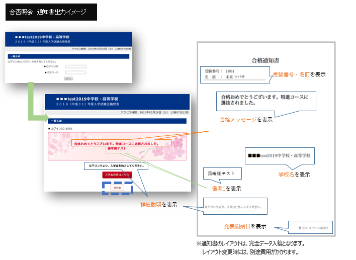 合否照会サイトで合格確認した受験生が、画面から「通知書」をダウンロードできるサービスです。